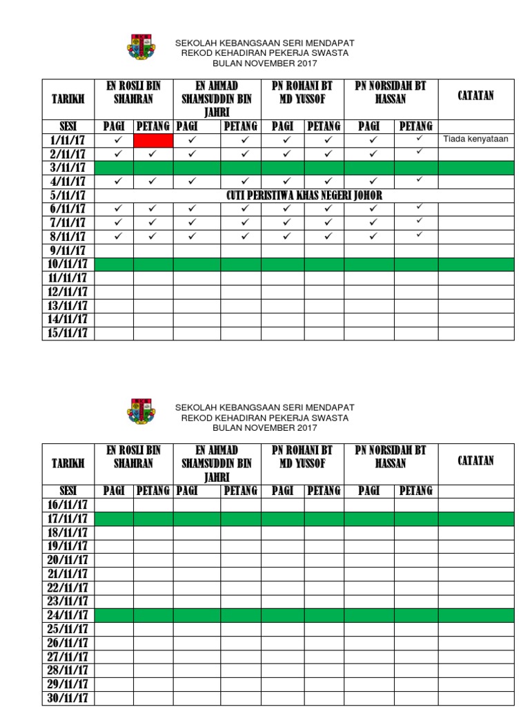 . Contoh Borang Rekod Kehadiran Pekerja. SEKOLAH KEBANGSAAN SERI MENDAPAT. Demikianlah beberapa ulasan artikel tentang contoh buku kehadiran pekerja yang dapat Anda jadikan referensi untuk mengetahui lebih jauh mengenai contoh buku kehadiran pekerja.